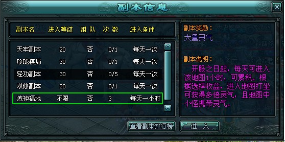 进入副本后打坐将获得灵气BUFF。灵气BUFF分为雾聚(双倍灵气奖励),水汇(三倍灵气奖励),成云(四倍灵气奖励)