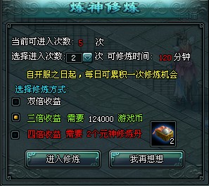 点击进入后,可设置进入的相关要求。若想获得四倍收益,则需要消耗1个元神修炼丹。