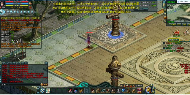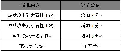 玩家进入活动场景以后可以无限制PK,不增加杀戮值。场景中有5根石柱,每个玩家通过攻击石柱来增加自己的得分。当石柱被攻击得粉碎以后,活动结束,计算 当场得分情况,来给予玩家奖励,每个玩家进入场景以后死亡后被传出场景,不可再次进入,只可使用当场复活道具在活动场景中复活。