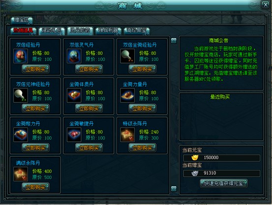 商城面板包含物品介绍、最近购买记录、当前元宝和赠宝查询等功能板块。
