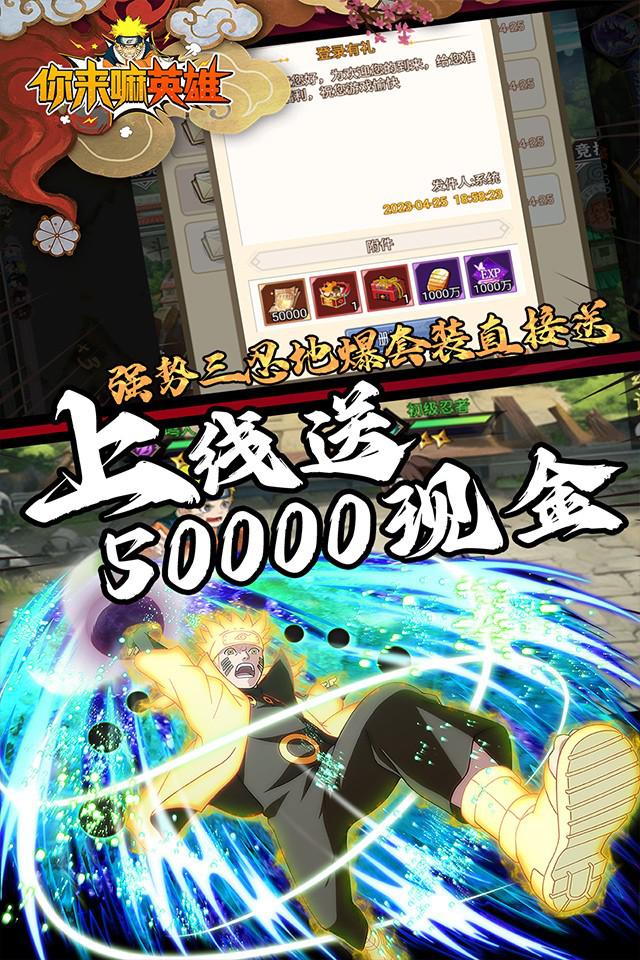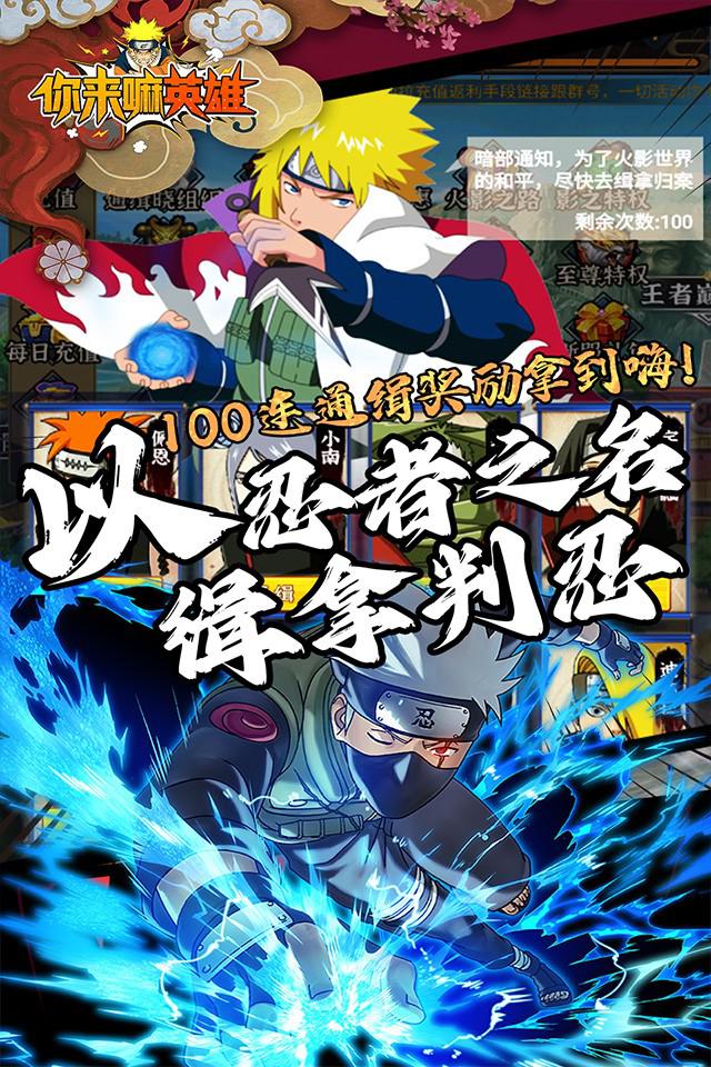 《你来嘛英雄(影级刷充爆打万金)》超影级挂机火影手游;制作精良,乐趣十足,福利满满,真正做到“不花一分钱,玩转火影世界”;每天上线送超值福利签到大礼,登录还赠送数十万现金券,让你想停都停不下来;首发送传说中的三忍助力,无敌之姿所向披靡;更有火之意志、影之特权,霸气加成!还在等什么,英雄,你来嘛?