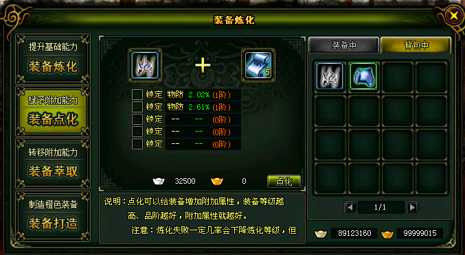 游戏中除时装外,所有装备均可点化,点化后的装备会增加一定的附加属性,点化的装备等级越高,所附加的属性就越好