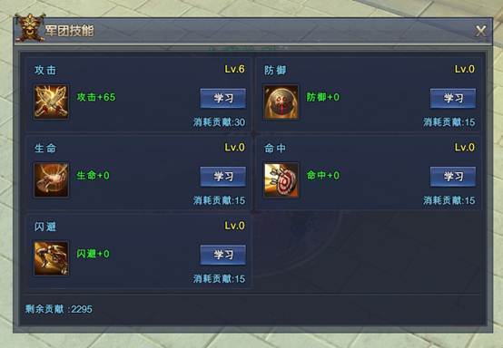 玩家通过消耗【军团贡献】来学习【军团技能】,军团技能可以提高本军团成员的基础属性;