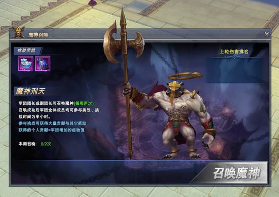 每周可由军团长或副团长召唤两次魔神,召唤后,所有成员在魔神 出现的时间 段内都可以挑战该魔神,根据成员对魔神造成的伤害进行排名,发放军 团贡献 及其它奖励