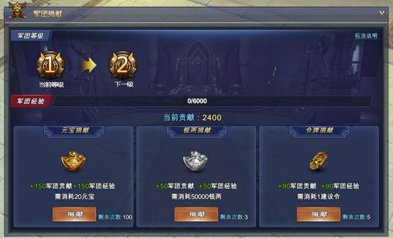 玩家每日可以给军团捐献一定的元宝、银两或是建设令,从而提升军团的经验,当 军团经验达到下一级时,即会自动升级。当玩家进行军团捐献时,也会获得【军团 贡献】值,【军团贡献】值可以在【军团商店】购买特殊道具。每天玩家可捐献的 次数是固定的,但VIP玩家可以进行额外的元宝捐献;