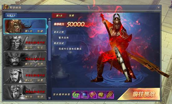 去挑战各种历史上的著名武将,完成首杀的成员将会获得大量奖励。可挑战的将领随着军团等级的提高而增加;
