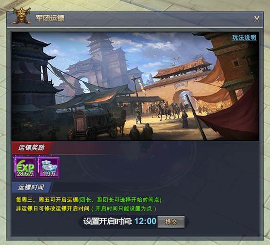 默认每周三、五中午开启军团运镖活动,本军团成员都可以参加,将镖 车安全 交付给NPC后,参与运镖的所有成员将获得丰厚的奖励。在非运镖日,团 长 和副团长可以自行设定军团运镖的开启时间点。