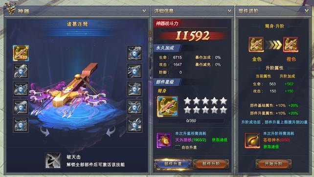 部件提升:玩家通过使用【天外陨铁来提升部件的星级,当星级满,则可通过【扶桑神木】、【苍梧神 木】或【凤凰神木】等道具以提升相应部件的阶级,升阶后,神器的品质将提高一级;