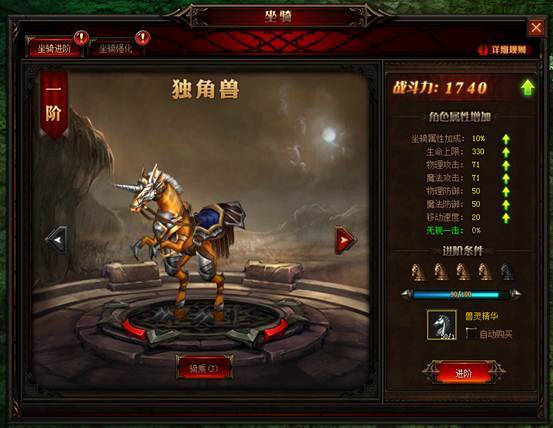6. 点击坐骑模型右边的箭头按钮可以预览高阶坐骑外观和属性