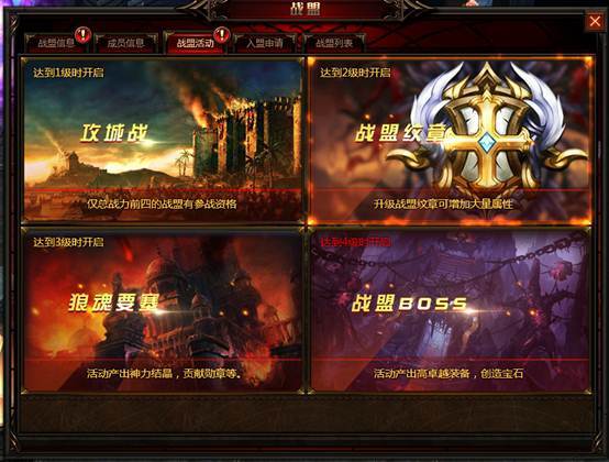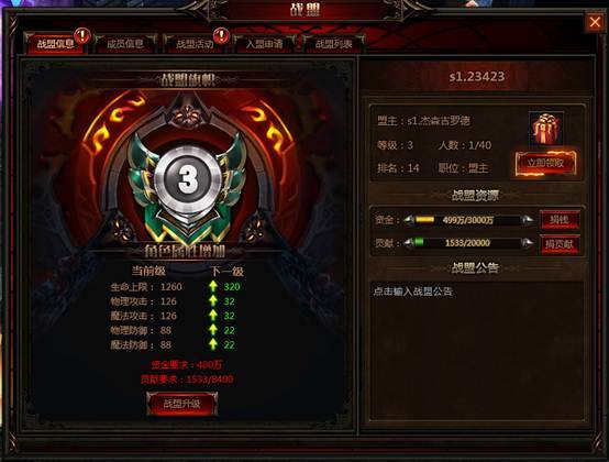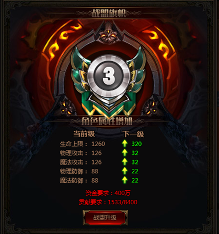 战盟可升级,升级需消耗一定的战盟资金和战盟贡献。