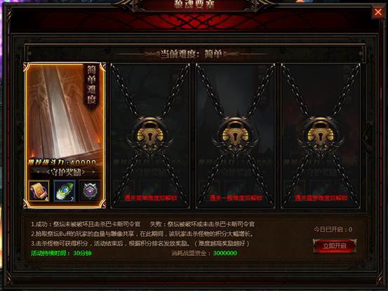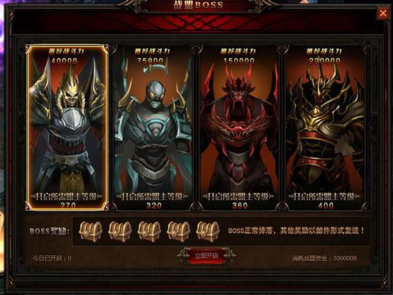 盟主或副盟主可选择开启的相应难度。(难度不同奖励不同。但每个BOSS开启时所需的盟主等级不同)