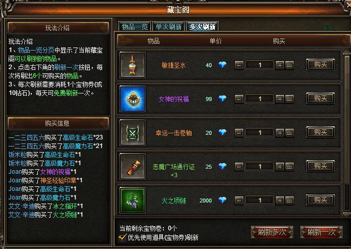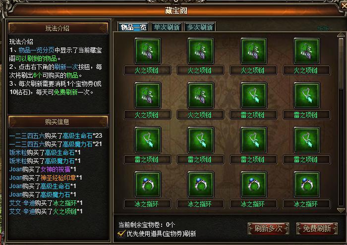 3、 批量刷新:使用宝物劵或钻石进行批量刷新,所有刷新的道具都会出现在‘多次刷新’界面里。