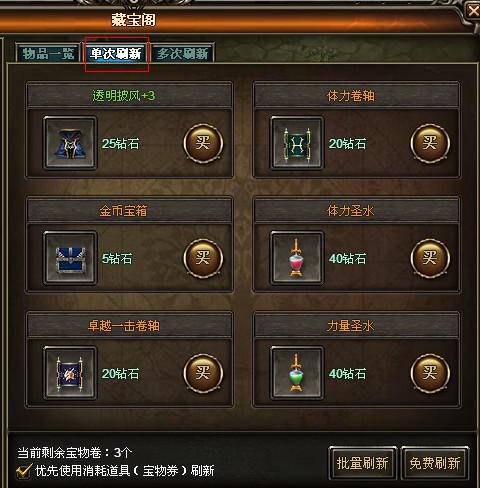 2、单次刷新:消耗宝物劵一张或10钻石,刷新单次刷新的物品列表