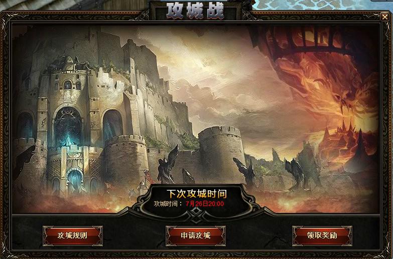 1、申请时间:开服第4天后,开启攻城战,每天的0:00到12:00申请当日攻城战,攻城战将于当天20:00~22:00开启