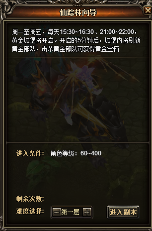 此副本不按等级与人数层次划分,所有60级以上玩家进入同一副本,对黄金怪物进行击杀