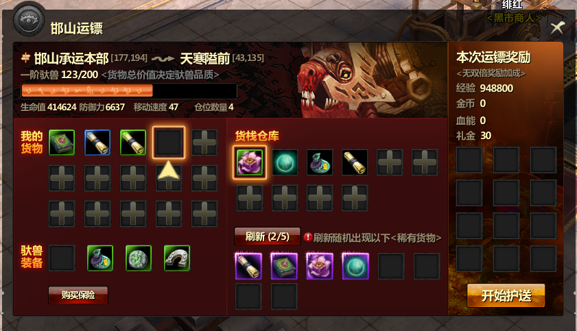 当接取运镖任务后,可选择自己要运送的货物,不同的货物对应不同的奖励,使用自己扩展仓位或刷新货物,经过不同的驿站,可以添加更多的货物,当最终把货物运送到终点,就能获得运镖奖励。