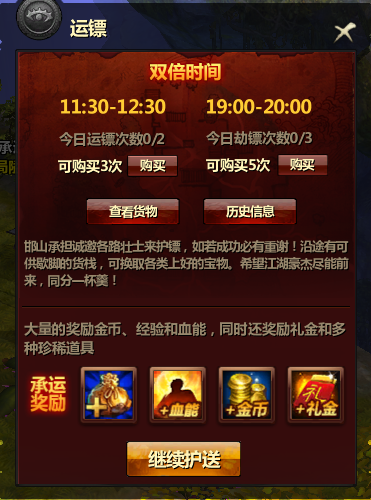 接取运镖任务时,可以选择是否购买保险,一旦购买后被劫镖不会损失奖励,整个运送过程中都无需再次购买保险。并且在运送途中随时可以选择是否补买保险。