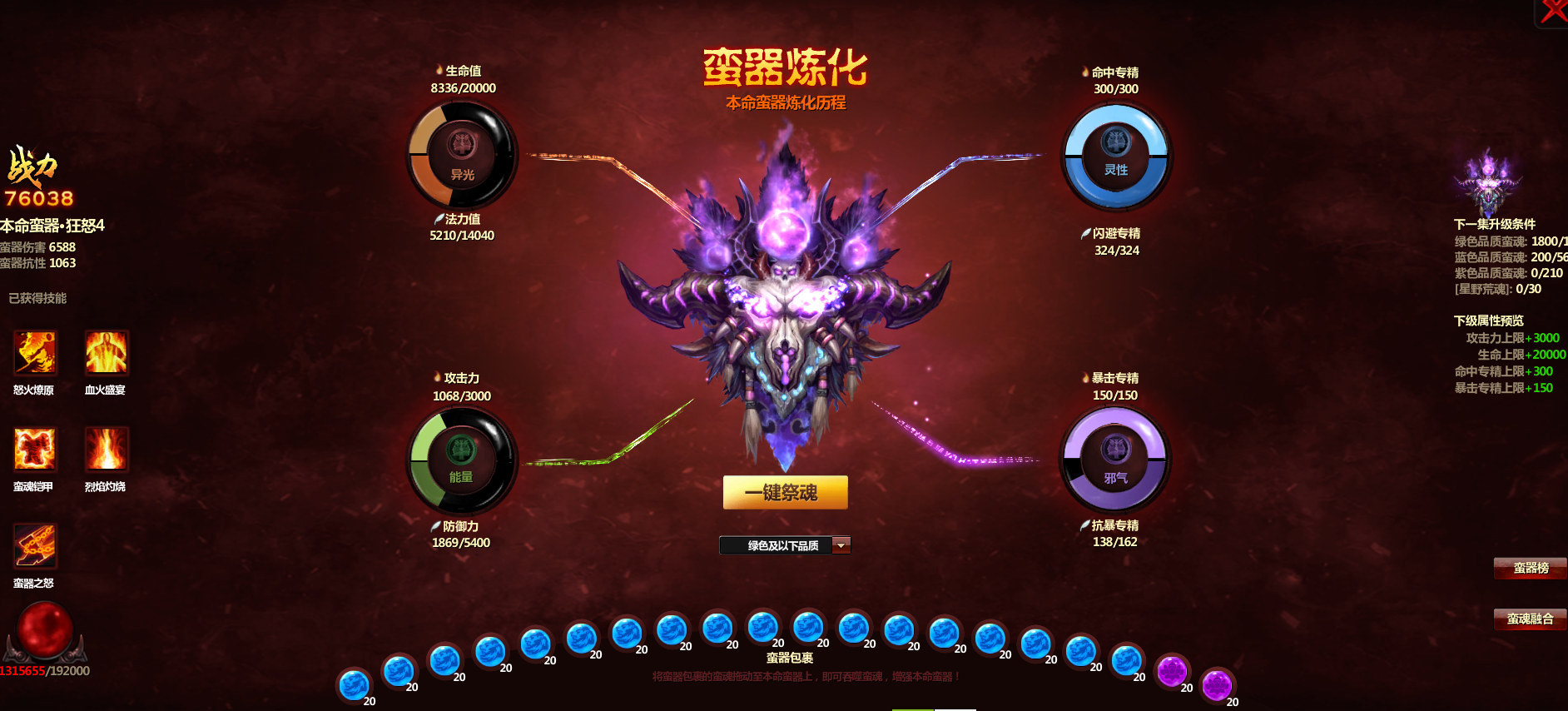 为了配合蛮器这条成长线,我们做了掉落蛮魂道具的蛮魂副本,玩家每天可进入三次蛮魂本,击杀小怪和boss能够掉落蛮魂晶石,蛮器吞噬掉晶石后就可逐渐壮大成长。