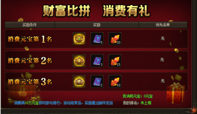 活动期间,玩家累计消费达10万元宝即可参与排名。上榜玩家即可获得极品灵石盒,强化技能书以及天帝碎片。