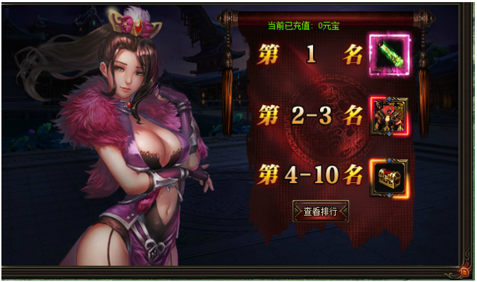 活动期间,玩家累计充值排行,与全平台玩家同场较量。第一名玩家可获得飞升武器!第2-3名玩家可获得飞升衣服,4-10名玩家可获得飞升防具箱