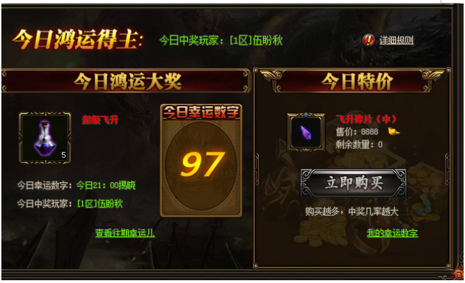 活动期间玩家可购买超低折扣道具,购买道具即可获得一个随机数字。每天晚上21:00系统将开出幸运数字。拥有该数字的玩家将获得幸运大奖!
