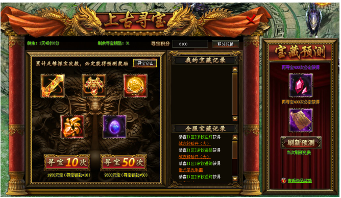 上古寻宝中可以获得大量极品道具。更有宝藏预测。在上古寻宝中的寻宝次数累计达成目标,即可额外获得一份超值大奖!奖励多多,选择多多。