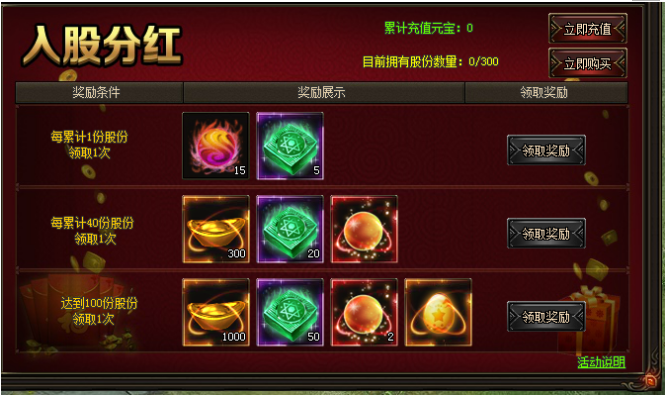 活动期间,玩家达成条件即可购买股份。购买的股份越多可领取的奖励越多。超极限奖励,不容错过!