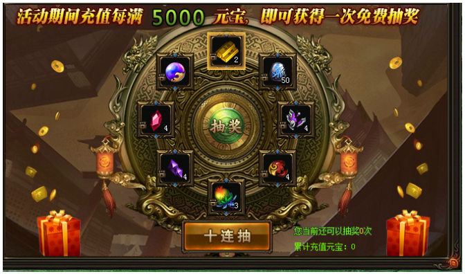 活动期间,玩家每充值满5000元宝即可获得免费抽奖的机会!大量奖励等你来拿!