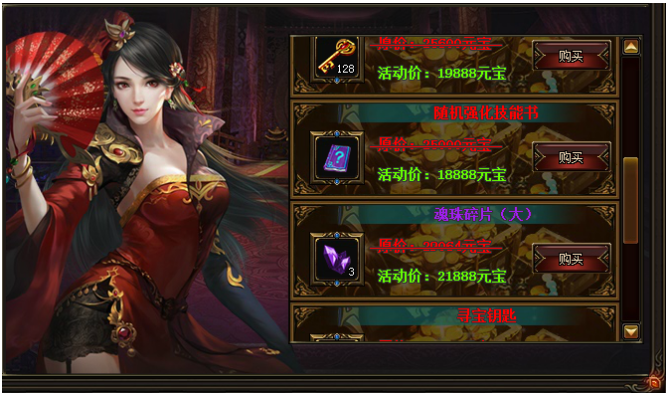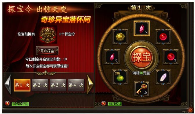 活动期间,玩家可通过击杀BOSS或参加活动获得探宝令。消耗探宝令可以开启神秘探宝,消耗少量元宝即可获得超值极品道具。探宝每天0:00清空重置。