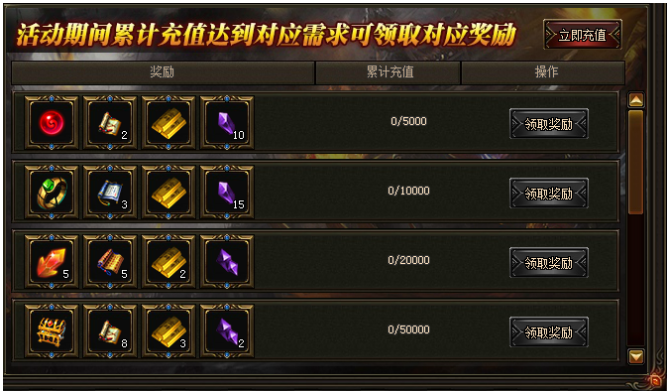 活动期间,玩家累计充值达到目标即可领取巨量极品奖励!