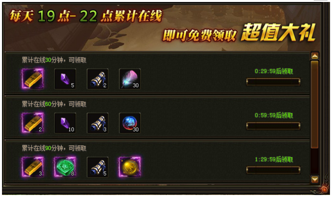 活动期间,玩家每日在固定时间段内登录游戏,累计在线时间,即可领取大量奖励!