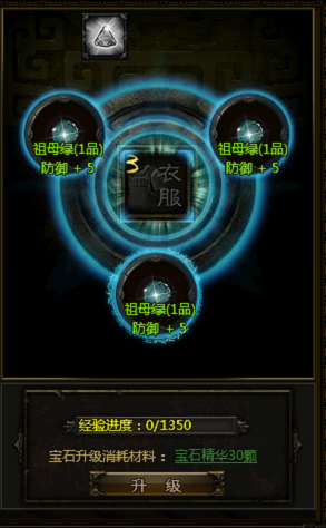 游戏中可以镶嵌宝石的部位分为十处每一处可以镶嵌三颗同样的宝石,分别是武器,衣服,护腕,护腿,鞋子,头盔,项链,戒指,佩绶和腰带。每个部位所镶嵌的宝石种类均已固定,这样能够让玩家很方便的选择自己最需要的属性进行优先投入,而且宝石属性不会随着换装而消失,就算玩家未穿戴的装备也会拥有那个部位的宝石效果,所以说宝石是一个很值得玩家投入的系统。最开始时各处的宝石均为未激活状态每激活一颗宝石需要消耗4500点真气,激活后宝石显示为宝石所附带的属性且宝石为高亮状态。当把一个位置的三颗宝石全部激活后会出现升级宝石的字样,升级宝石需要消耗宝石精华,宝石精华在游戏中比较容易获得。升级宝石的时候需要一颗一颗升级,因此对于宝石精华的消耗也算是比较大的,玩家在平常游戏中可以多积攒一些。