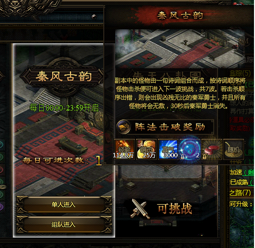 秦美人中,玩家达到40级后会开启挑战,挑战中有许多既有趣又能获得丰厚回报的活动,今天主要给大家讲解下秦风古韵活动。点击挑战选择文韬武略中的秦风古韵,此活动可以单人或者组队进入,难度不大,可以尝试单人挑战。成功通过挑战可以获得大量经验铜币以及前期十分珍贵的坐骑进阶丹,因此此活动为玩家每日必备挑战。