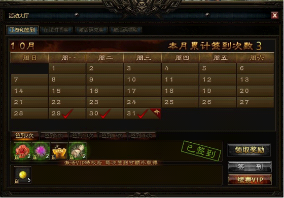 打开活动大厅就可看到签到领奖系统,签到次数越多,获得奖励越好,成为vip还能获得额外奖励: