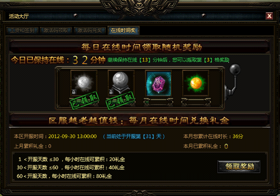 每日在线时间长的玩家,也可以获得奖励,不但每隔一段时间免费摇奖一次,还可以在月底获得一大笔礼金奖励,越老的服领取的礼金也越多: