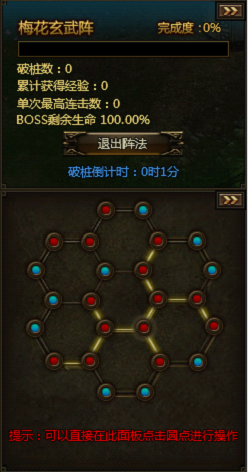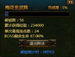 玩家进入副本之后,可以在界面右边看到梅花玄武阵的进度图;展示了玩家的破桩数、获得经验、单次最高连击数和BOSS的剩余生命值,以及破桩时间。
