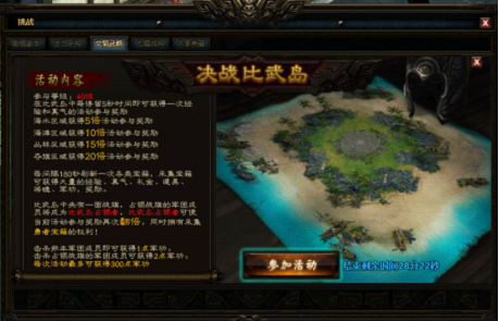 每周3、周日的晚上21:00—21:30,角色等级达到40级以上的玩家,可以通过挑战面板(文韬武略)或活动开启TIPS面板传送进入比武岛场景,整个场景可自由进行PK。