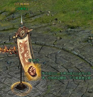 3. 比武岛的夺旗区域有一面战旗,只有加入帮会的玩家才能夺旗,鼠标点击该旗帜并等待读条结束,即可视作占领,同时在占领帮会玩家的名字上方,会出现提示:比武岛占领者。
