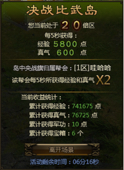 进入比武岛之后,可以在原“任务追踪面板”位置查看到比武岛奖励信息,包含当前所在的倍数奖励区域,每5秒的奖励收益,以及各项累计获得收益统计;