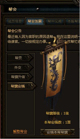 同一时间内一张地图上只能存在一面帮旗,当一个地图里已有其他帮派的帮旗时,必须想要将它砍倒才能安插自己的帮旗