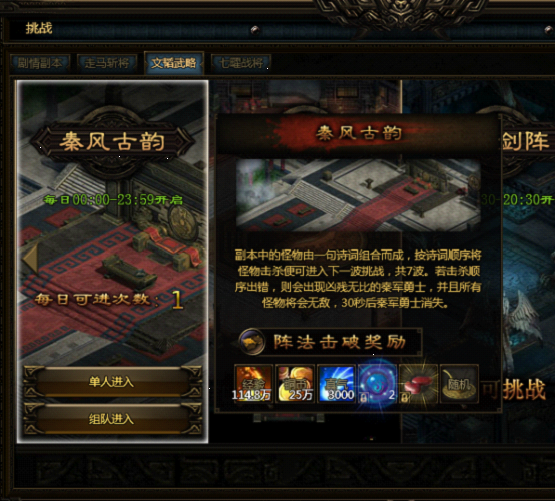 角色等级达到40级,可以在挑战面板中查看到秦风古韵副本