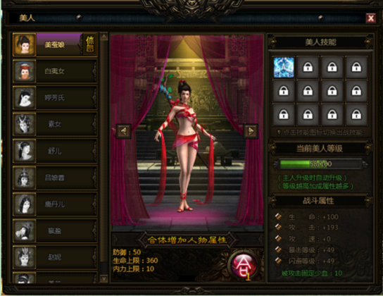 当美人掌握更多的技能之后,技能的切换与组合搭配,则是一门技巧,有的美人可以辅助战斗,有的美人则是强力的输出,好好搭配他们的技能,能让你的PK和刷怪变得更加轻松惬意。