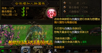 美人的等级和属性是随玩家等级提高而提高;越是后面招募的美人,属性越高,可合体次数更多,与她们合体能永久提升玩家属性加成,合体拥有总次数限制和每日次数限制,所以小编在登陆游戏后,立即毫不掩饰、迫不及待与2位心爱美人进行了合体