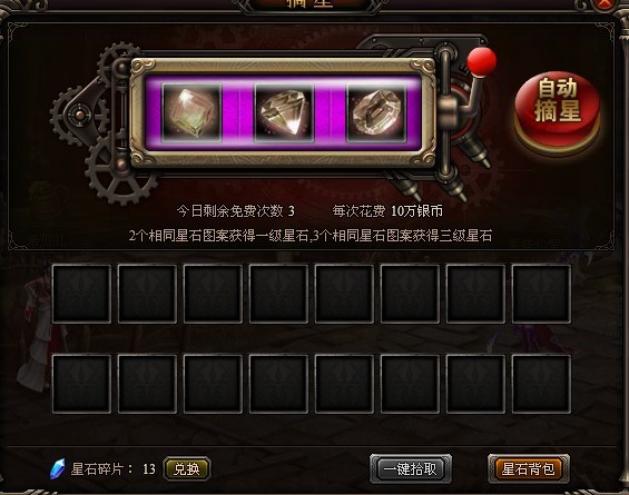 上图为摘星界面,俗称摇奖,请大家注意摇奖机的底色图案为紫色,这个颜色代表如果运气够好,你可以摇出紫色品质的星石(条件为3个图案一致)以此类推,如果底色为蓝色,则理论上可以摇出蓝色星石。所以下次再摇奖的时候多多观察底色变化规律,你也可以拥有橙色星石~最后感谢大家观看攻略。