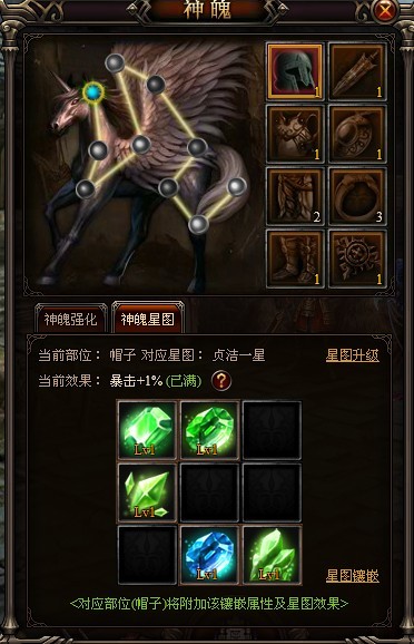星图升级以上图中的帽子举个栗子,帽子对应的新图是贞洁一星,如图中所示,星图中已经镶嵌满了5颗不同品质的星石,由于这5颗星石的等级都是1级,因此等级符合效果要求,享受暴击+1%的加成,上图中的暴击+1%为绿色,表示角色已受到暴击+1%的加成。GOODJOB。