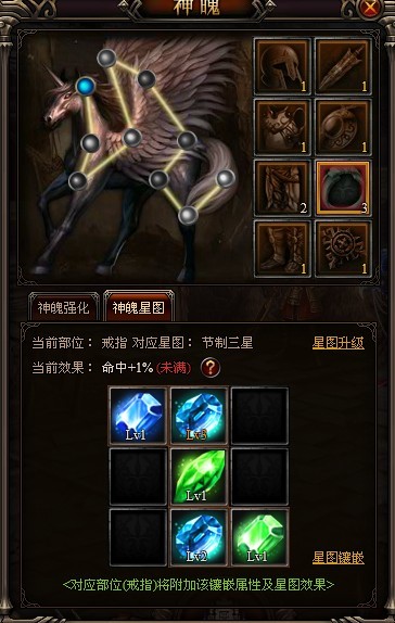 上图中,戒指对应的节制星图已经升级到了3级,但是星图中所镶嵌的星石只有1颗达到了3级,因此没有满足加成条件,所以无法享受命中+3%的效果,(因为星图已经升级到三星,所镶嵌的宝石均大于1级,因此实际享受加成效果仍然为命中+1%,如果星图中所镶嵌的星石均为3级,则才满足条件,能享受命中+3%的效果加成)。终上所述,如果前期没有良好的装备和等级相符的星石,不要贸然点击星图升级,可以将这笔投资用到神魄升级或则装备强化上面。