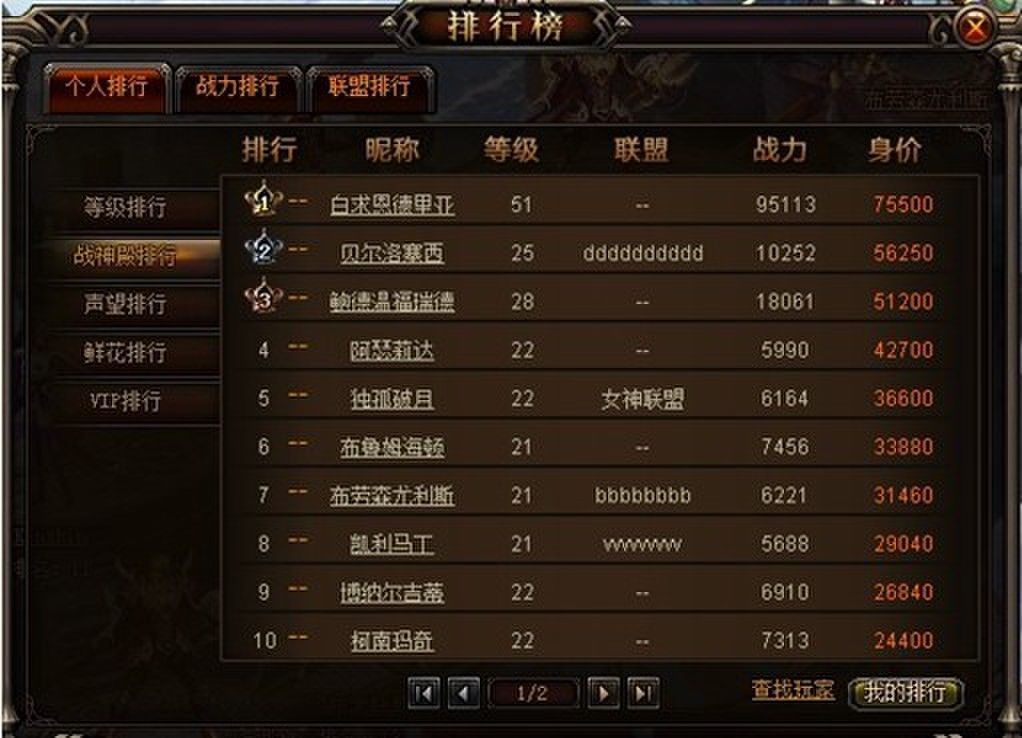战神殿排行是排行榜功能中的一个环节。点击左侧“战神殿排行”按钮即可进入查看战神殿排行信息,包含有玩家个人信息(点击玩家名字可查看)、等级、帮会、战力和身价。