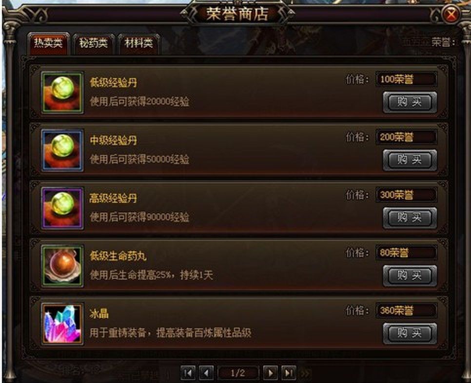 可兑换的物品分为热卖类、秘药类、材料类三类,每种物品所需的荣誉值是不同的。