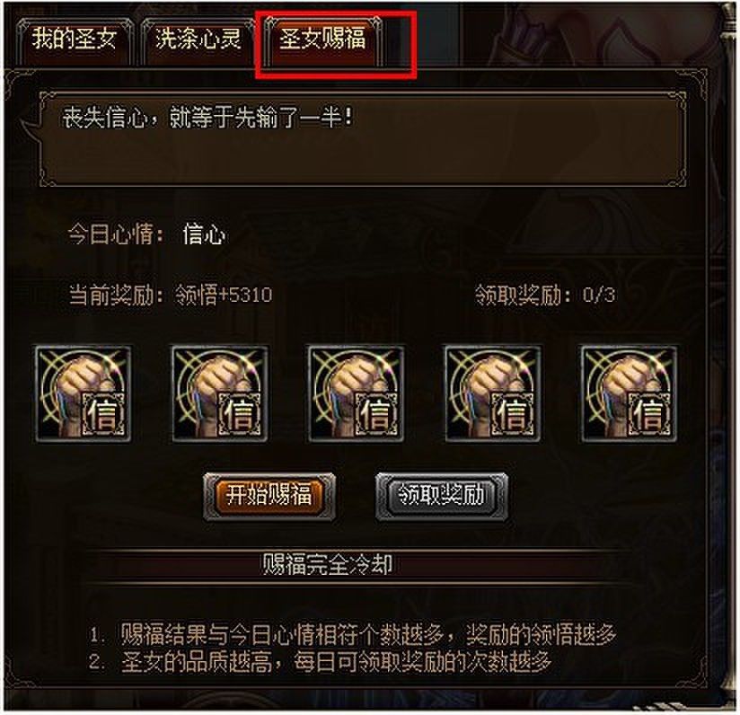 点击“开始赐福”,该面板中的五张图片会滚动起来,待自动停止后有图片与今日心情一致,那么可以获得对应的领悟奖励,相符的越多奖励的领悟越多。