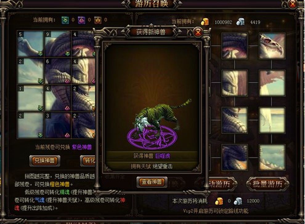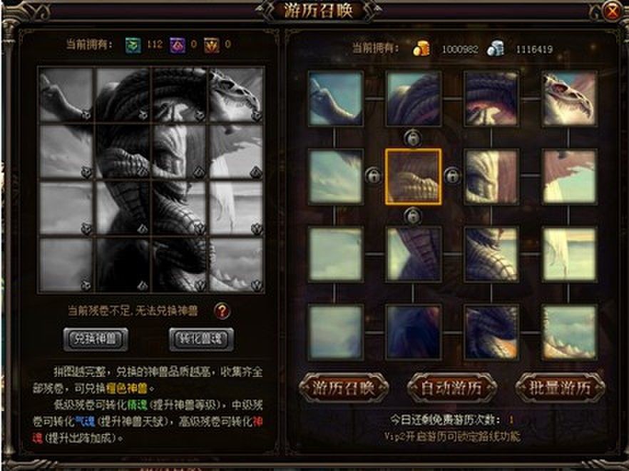 在《骑士战歌》中,召唤神兽是通过收集残卷的方式实现的。点击上图右侧界面的“游历召唤”按钮,可随机获得不同部位残卷,收集到的残卷将在左侧拼图窗中点亮(每块拼图左上角的数字表示该位置拼图的拥有数量)。拼图越完整,兑换的神兽品质越高。